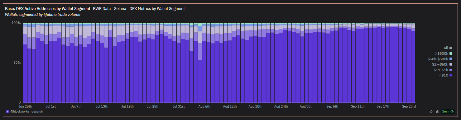 Nonetheless, Blockworks and others have pointed out the fallacy of measuring daily active users several times. Researching Solana, they discovered that “When segmenting active addresses (traders) by their lifetime volume, over 80% of active addresses trade less than $10 of volume”.