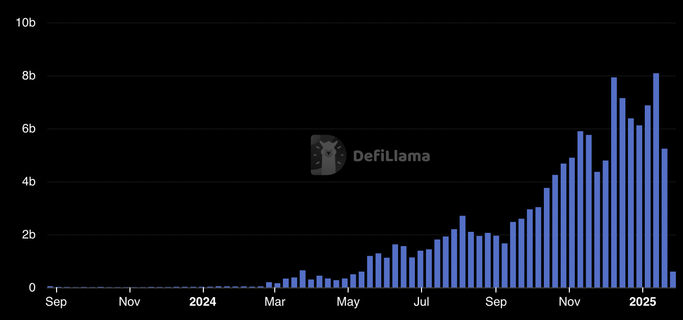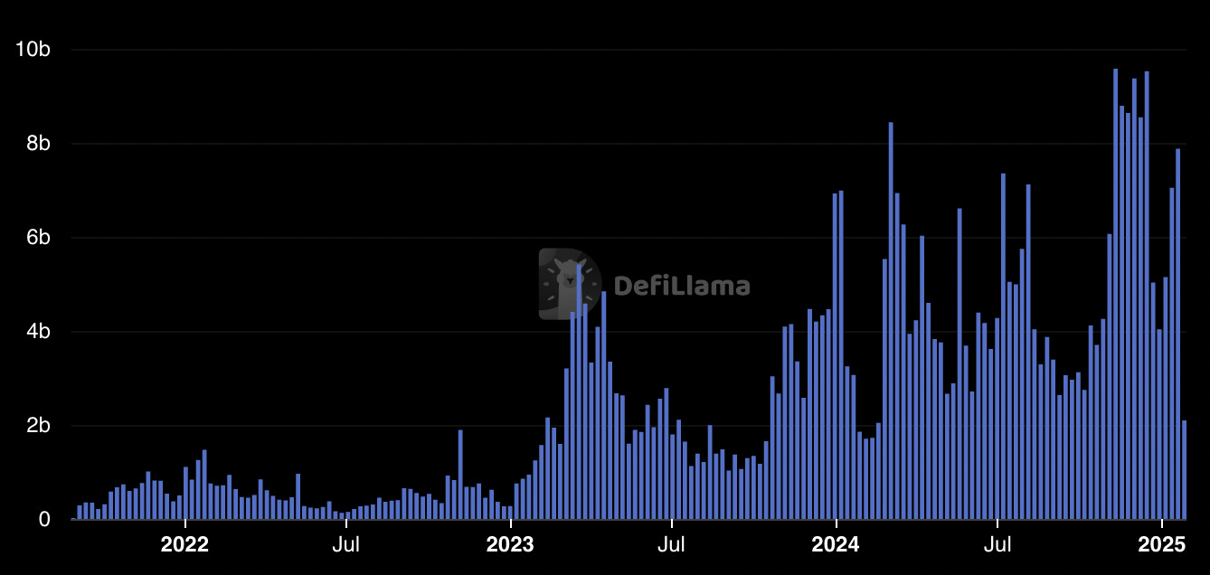 Base surpassed Arbitrum in DEX volume in September 2024, driven by Aerodrome’s rapid growth, which saw volumes rise from an average of $2.8 billion weekly in September to an all-time high of $8 billion in December 2024.