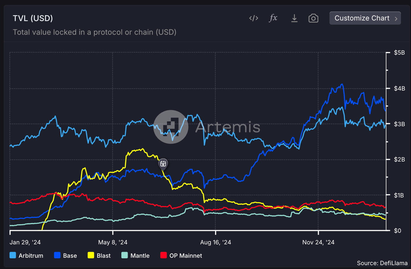 Until October 2024, Arbitrum was the leading L2 in terms of TVL. Nowadays, Base leads the pack with $3.6b, followed by: