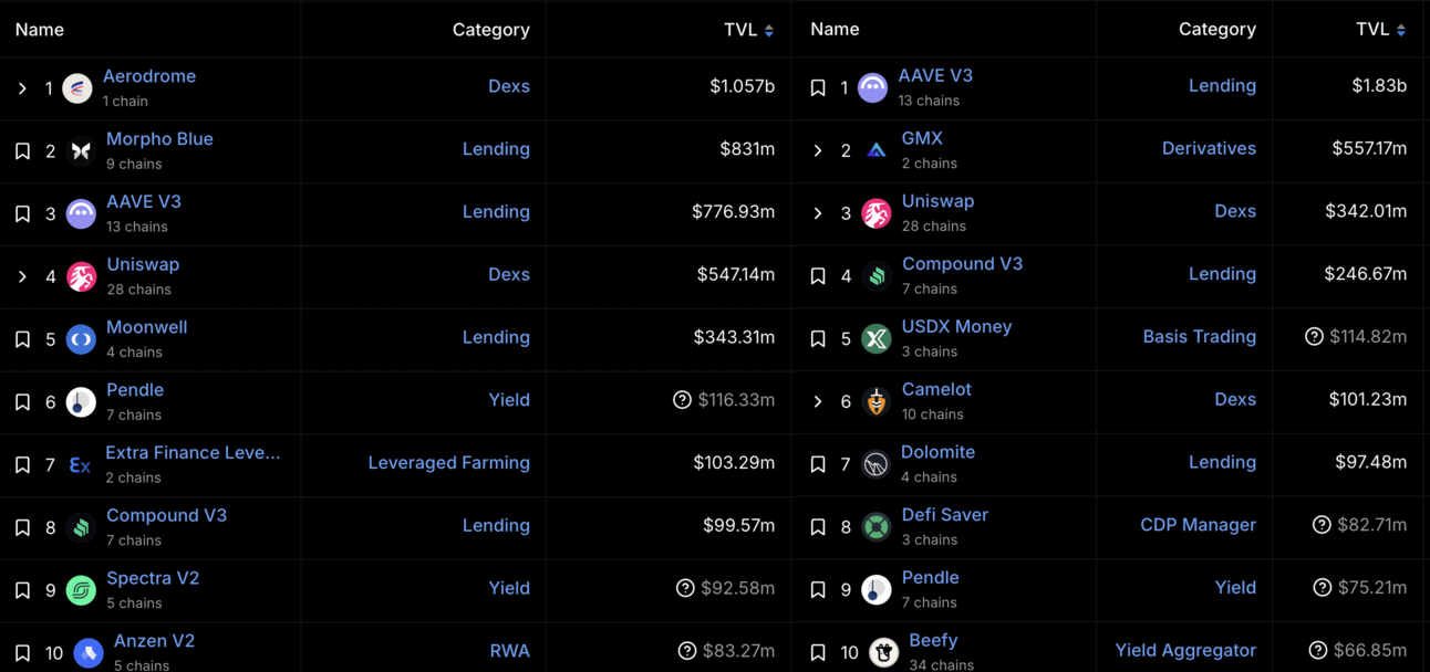 Here are the top 10 protocols by TVL on Base and Arbitrum, as reference: