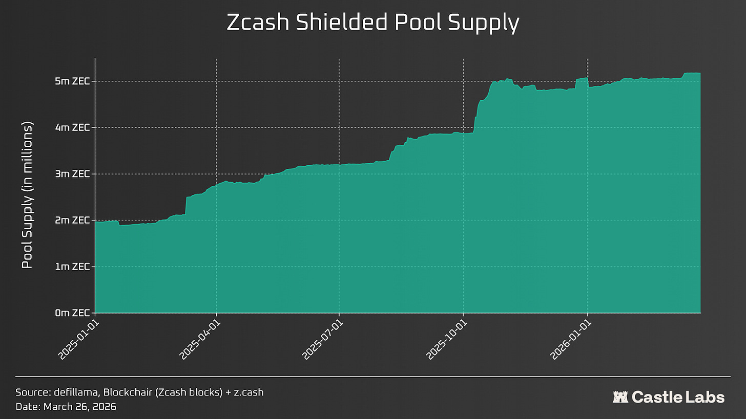 Historically, adoption of Zcash shielded pools has remained between 10% and 30% of the total supply, as users default to transparent transactions when they need composability. Even Zcash Connect, the bridge to Ethereum DeFi, requires unshielding at every protocol boundary.