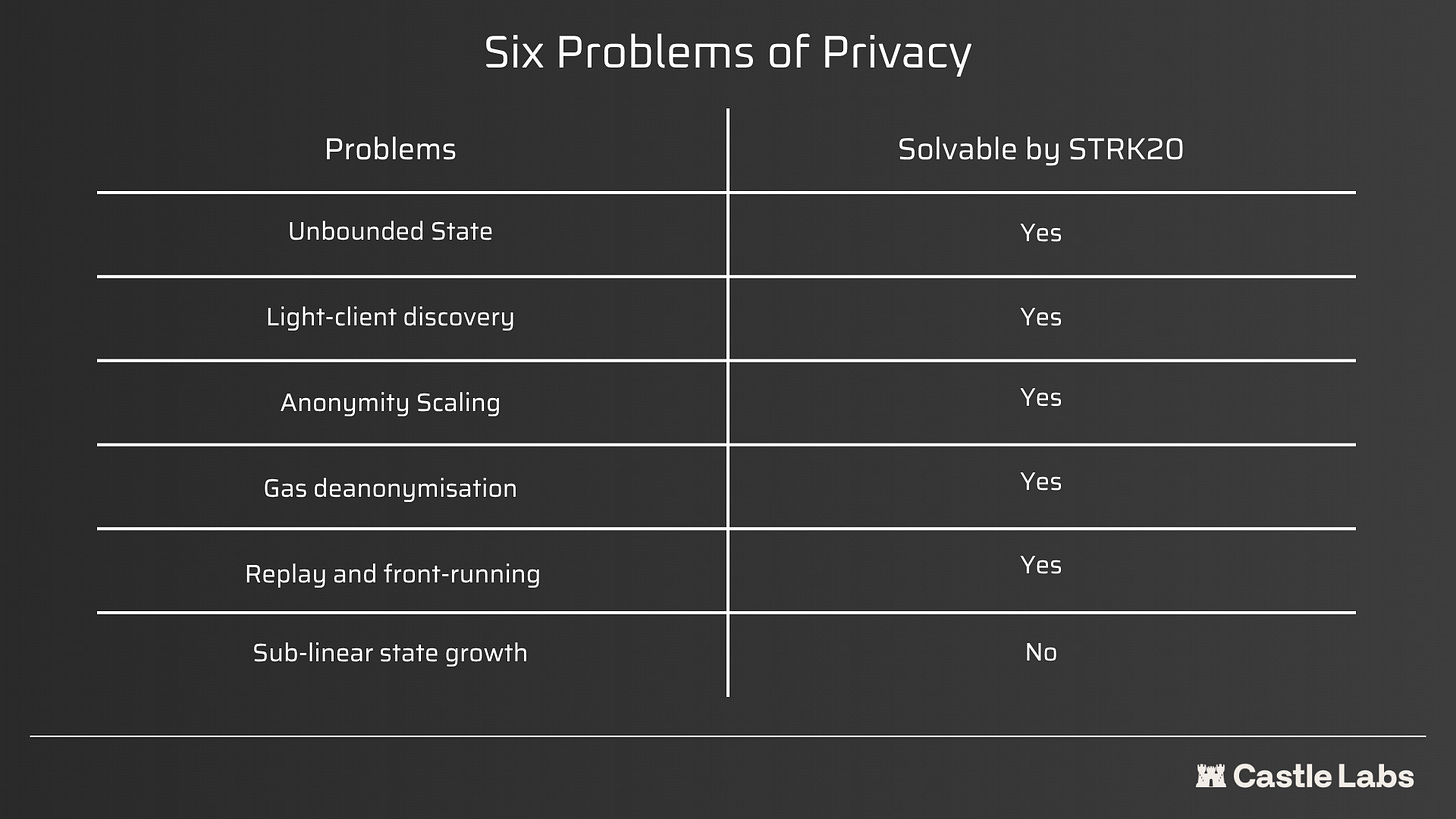 The Five Pillars of STRK20 and the Six Problems of Privacy