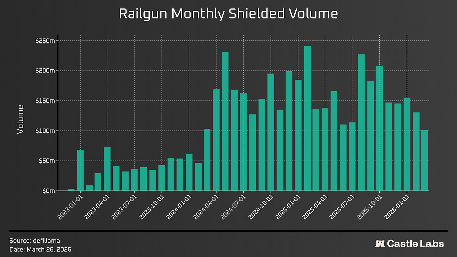 Within this category, Railgun is the most successful implementation. Backed publicly by Vitalik Buterin, Railgun processed $1.6 billion in shielded transactions in 2025 and hit $4 billion in cumulative volume. It applies zk-SNARKs at the smart contract level on Ethereum, allowing users to shield any ERC-20 token and interact with DeFi protocols from within a private balance. But Railgun remains an application sitting on top of a transparent chain. TVL bounds the anonymity set in the shielded pool (currently around $83 million), which means a sufficiently motivated chain analyst at the IRS can narrow the set of possible participants. It is the best version of app-level privacy, but it’s not bulletproof.