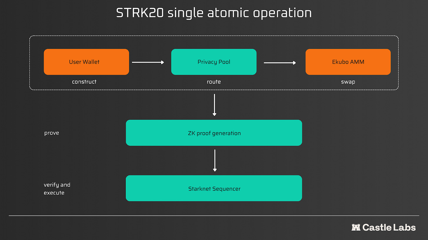 As an example, Ekubo provides liquidity, while shielded strkBTC and unshielded USDC interact with the same pool. There is no separate privacy DEX to bootstrap from zero liquidity. The market depth that exists on Starknet from day one is the market depth available to private users from day one.
