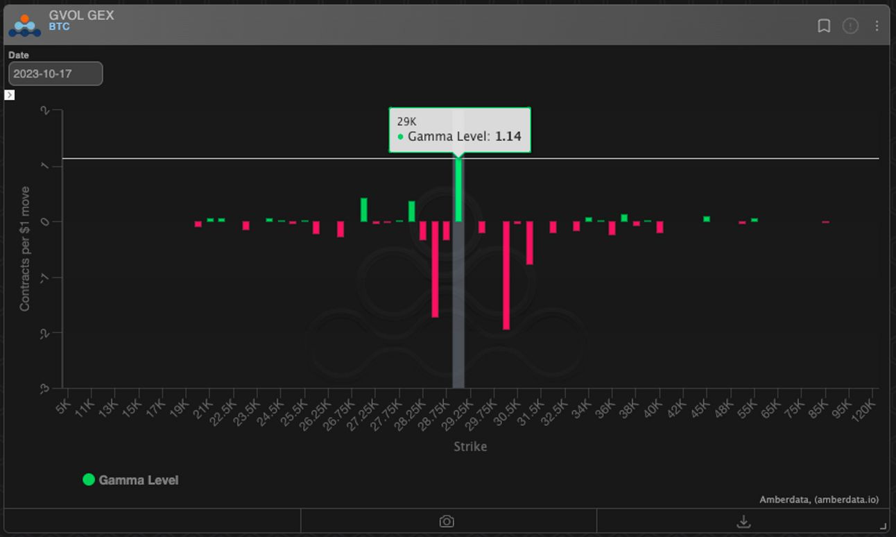 Considering BTC gamma charts, dealers are positively positioned around 29k and negative beyond this barrier. If we push past 29k, it could be a swift move up towards 31k.
