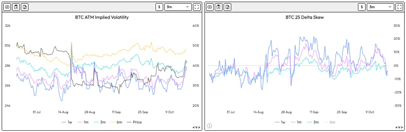 BTC IV and Skews: IVs shot up 10% points with the misreported ETF news and are currently staying elevated as dealers seem to start to hedge positions past 28k. Skews became more bullish with the push upwards.