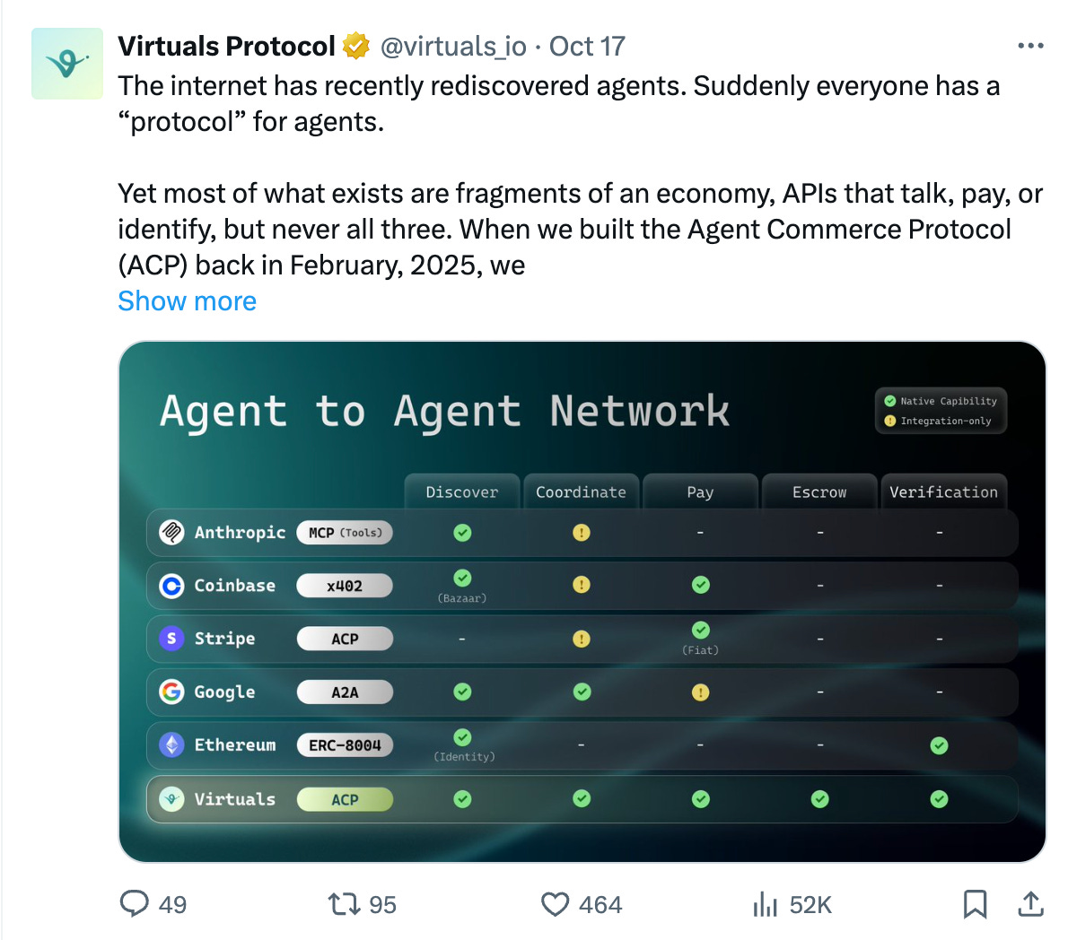 We haven’t been talking about Virtuals in a while! This week, they shared an analysis on their Agentic Commerce Protocol (ACP) and how it compares with others, such as Anthropic, Coinbase, Stripe, Google, and Ethereum.