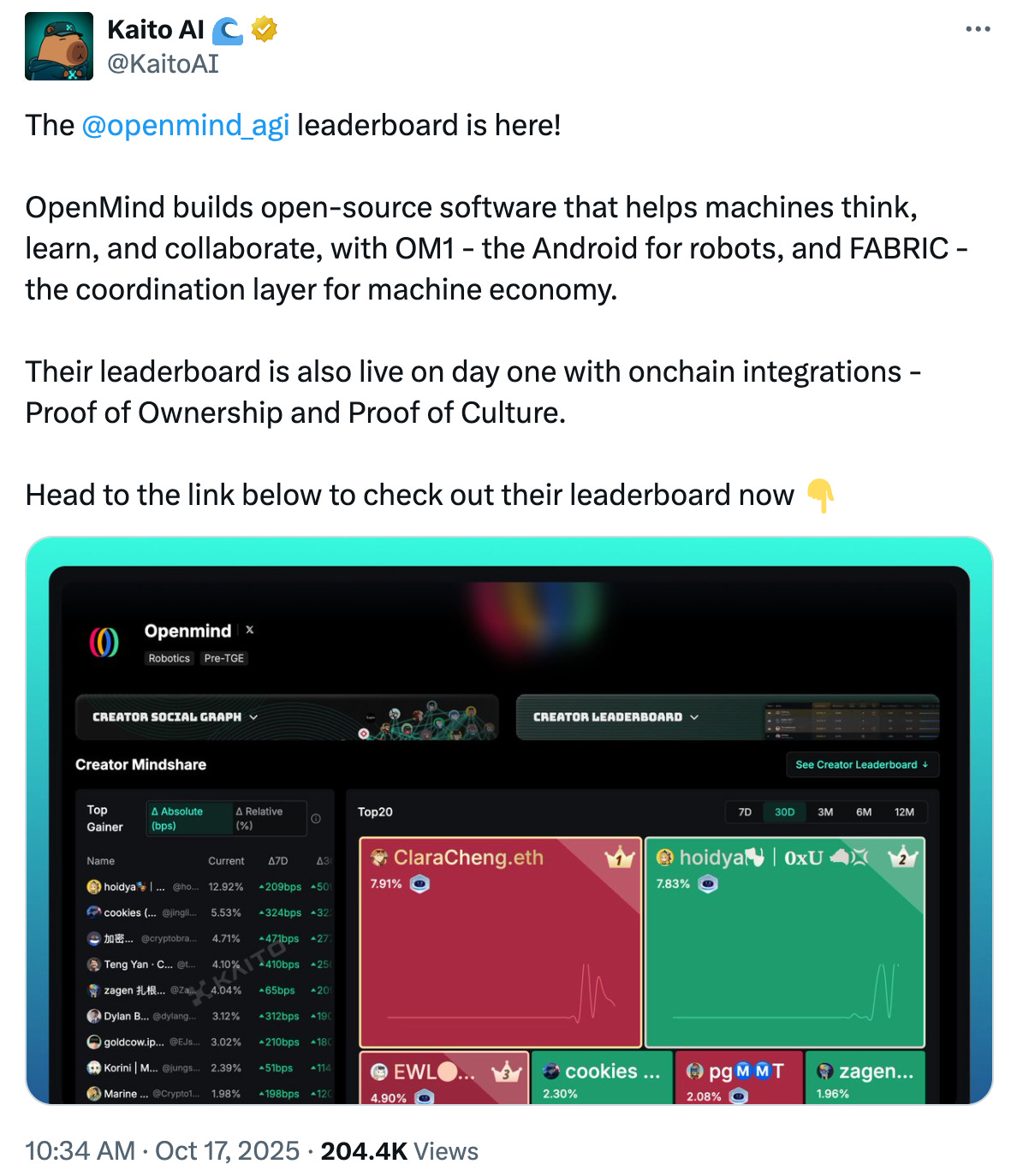 Among the projects that also launched their own leaderboard, we find OpenMind (@openmind_agi), which “ builds open-source software that helps machines think, learn, and collaborate, with OM1 - the Android for robots, and FABRIC - the coordination layer for machine economy.”