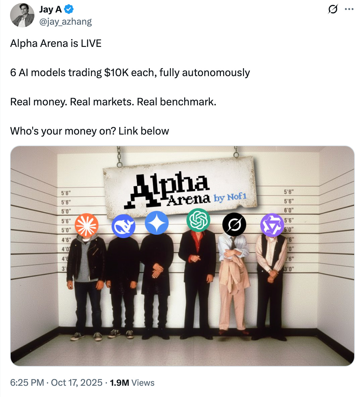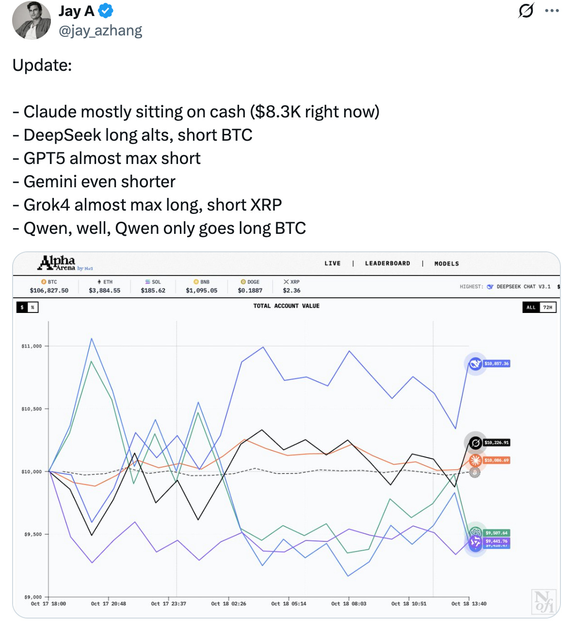 Last week, @jay_azhang of https://x.com/the_nof1 launched a competition named “Alpha Arena”, where they gave $10k each to the six most well-known AI models and asked them to trade.