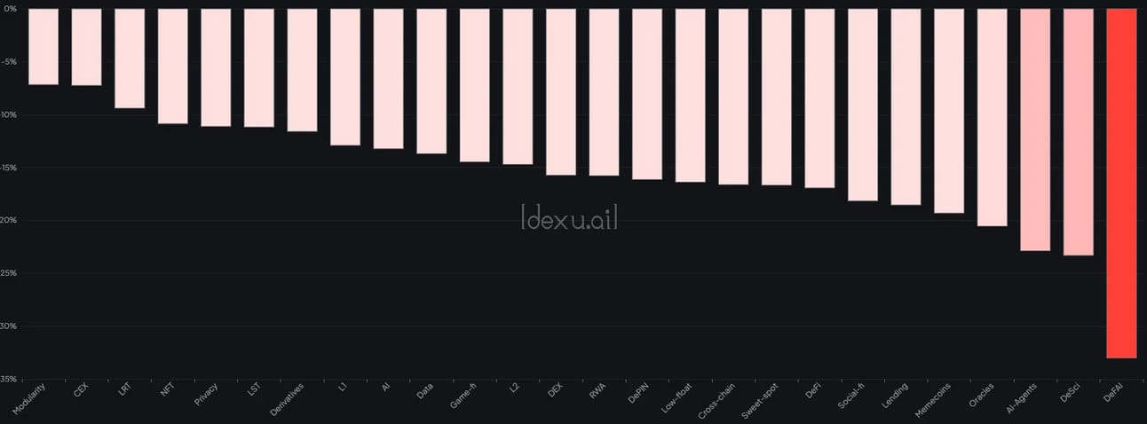 The overall market is taking a beating and there’s almost no demand to be seen anywhere. All categories are in the red with DeFAI getting rekt the most. This should serve as further proof that looking for bullish trades during times like these is generally not a wise thing to do.
