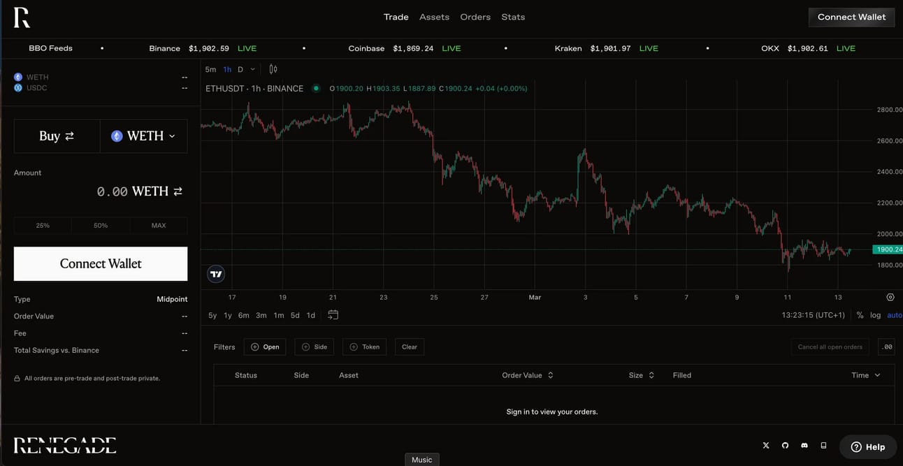 They can do so by leveraging multi-party computation (MPC) to match peer-to-peer orders and zero-knowledge proofs for trade settlement. All trades on Renegade are executed at the real-time Binance midpoint price, without any spread or price impact.