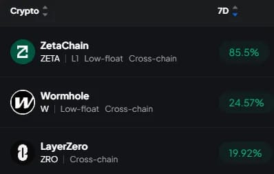 Wormhole and LayerZero are up 25% and 20%, respectively.