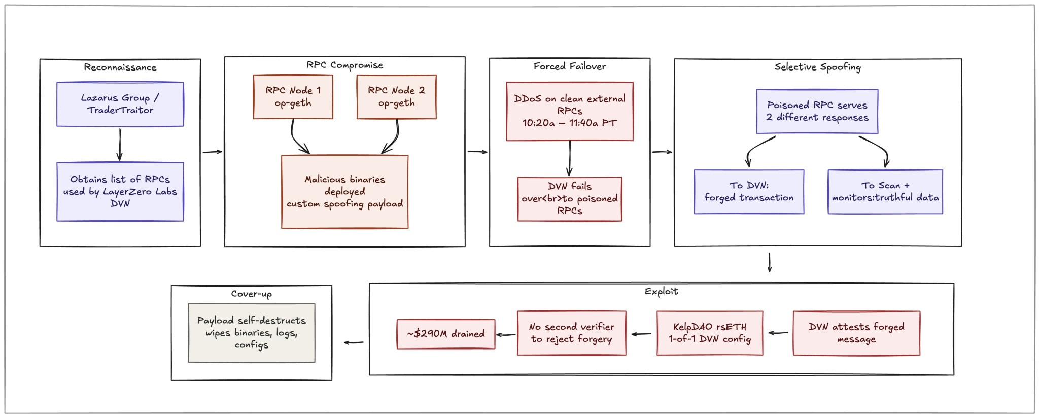 On Saturday (18 April), North Korea’s Lazarus Group is believed to have compromised two RPC nodes within LayerZero’s Distributed Verifier Network (DVN), whilst DDoS-ing the remaining nodes, forcing a failover to the compromised nodes. These compromised RPCs had been installed with malicious versions of the node software, essentially replacing the programmes these nodes run with versions that forge cross-chain messages, leading to Kelp’s bridge minting 116,500 rsETH, or 18% of the circulating supply. The software then self-destructed inside these nodes, wiping all binaries and logs.