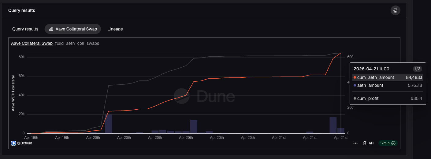 Fluid, working with Lido, EtherFi, 1inch, and other protocols, helped users swap ~84k aETH in collateral.