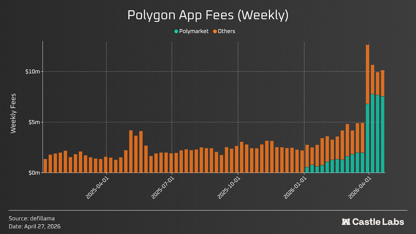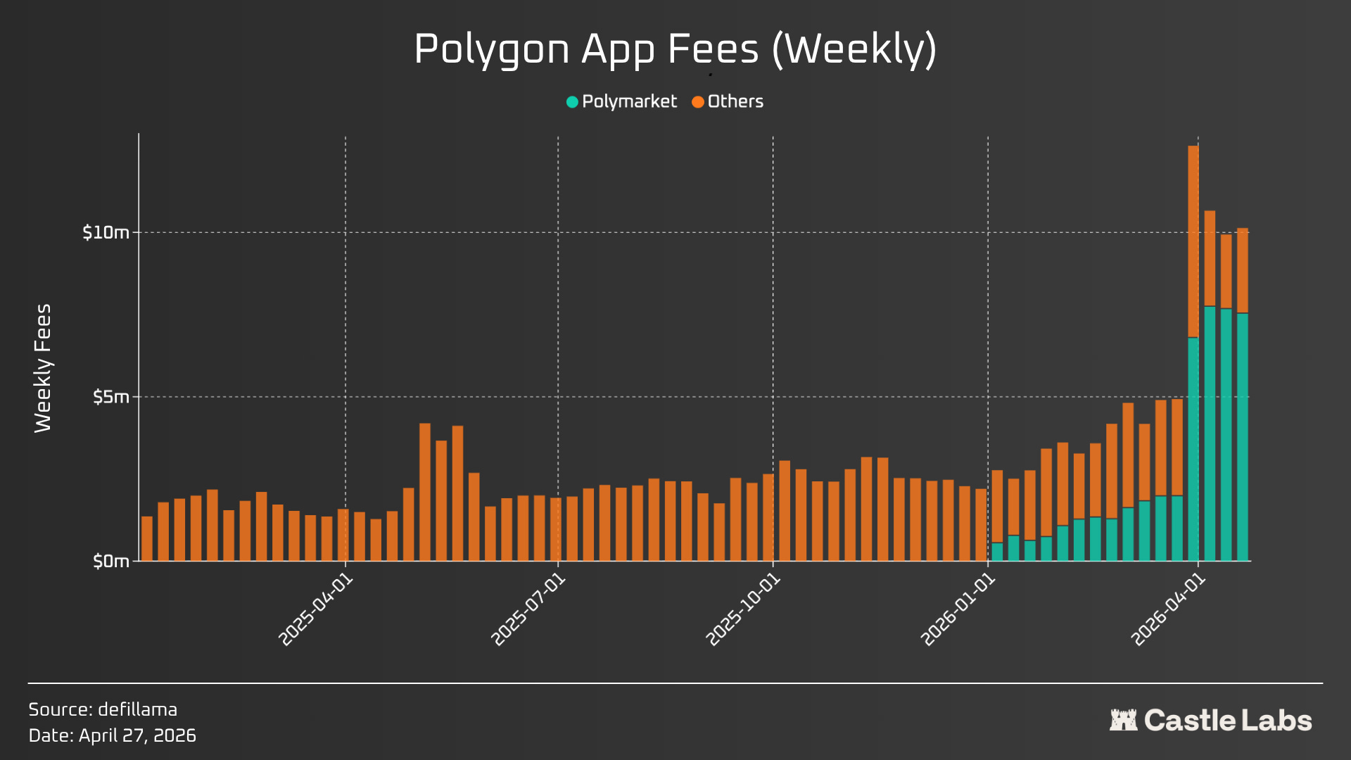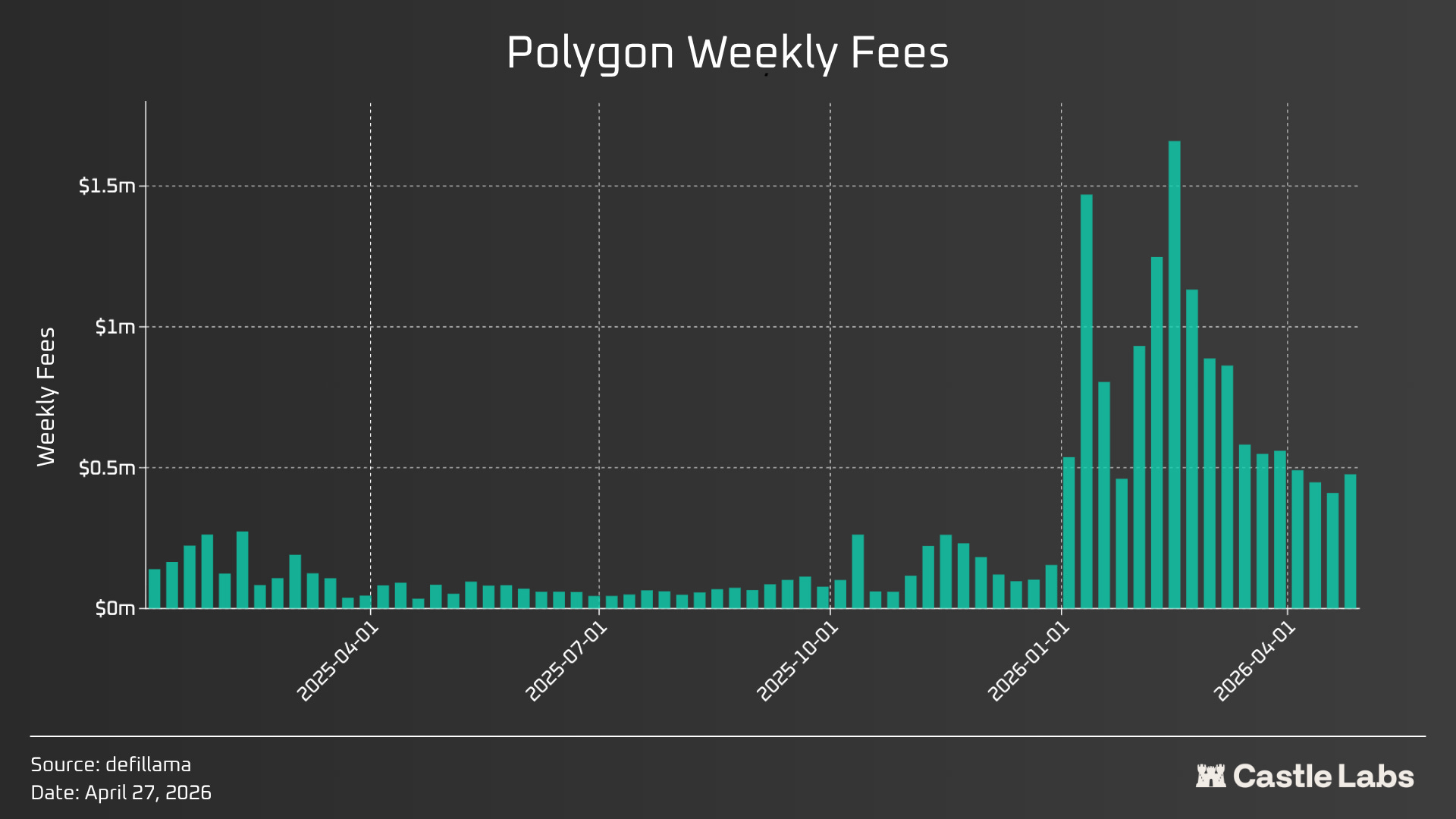 Polygon made $5.65 million in chain fees in 2025. In 2026, they have already surpassed this number, making $13.5 million since the beginning of the year. A large share of the fees comes from Polymarket after they enabled fees through additional contracts on their platform in early January, clubbed with their rising volumes. This is also reflected in the fee spike below in the first week of the year.