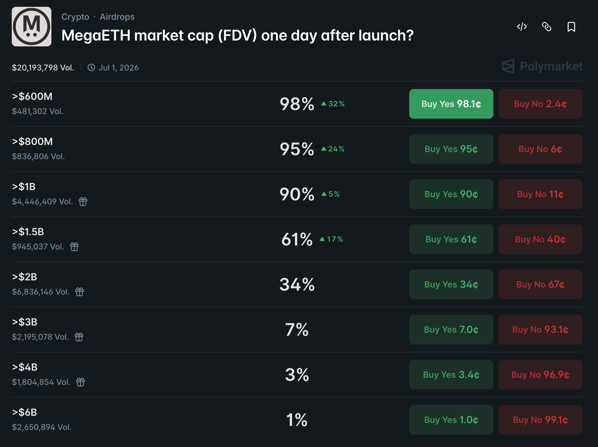 TGE is now just two days away, with speculation rife around opening valuations. The circulating supply is reported to be 6-7%. 1% from the Echo round, 1.25% from Fluffles, around 2% from the public ICO, plus whatever market makers and exchanges may receive. At pre-market, $MEGA is trading around $0.18, putting it at roughly a $1.8B FDV; meanwhile, Polymarket is pricing a 90% chance of launching with an FDV over $1B, matching the ICO price.