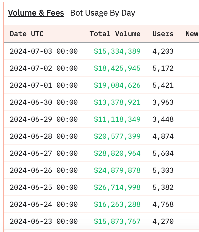 As you can see the bot almost consistently pulls over $15mln in volume. Every. Day. And the market has not been as fruitful lately.