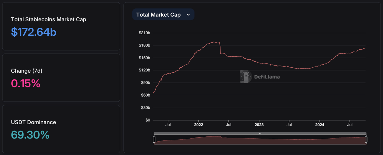 Let's take a moment to analyze the stablecoin market. Currently, the total supply of stablecoins is $172 billion—only 8.5% down from the all-time high of $188 billion reached in April 2022.