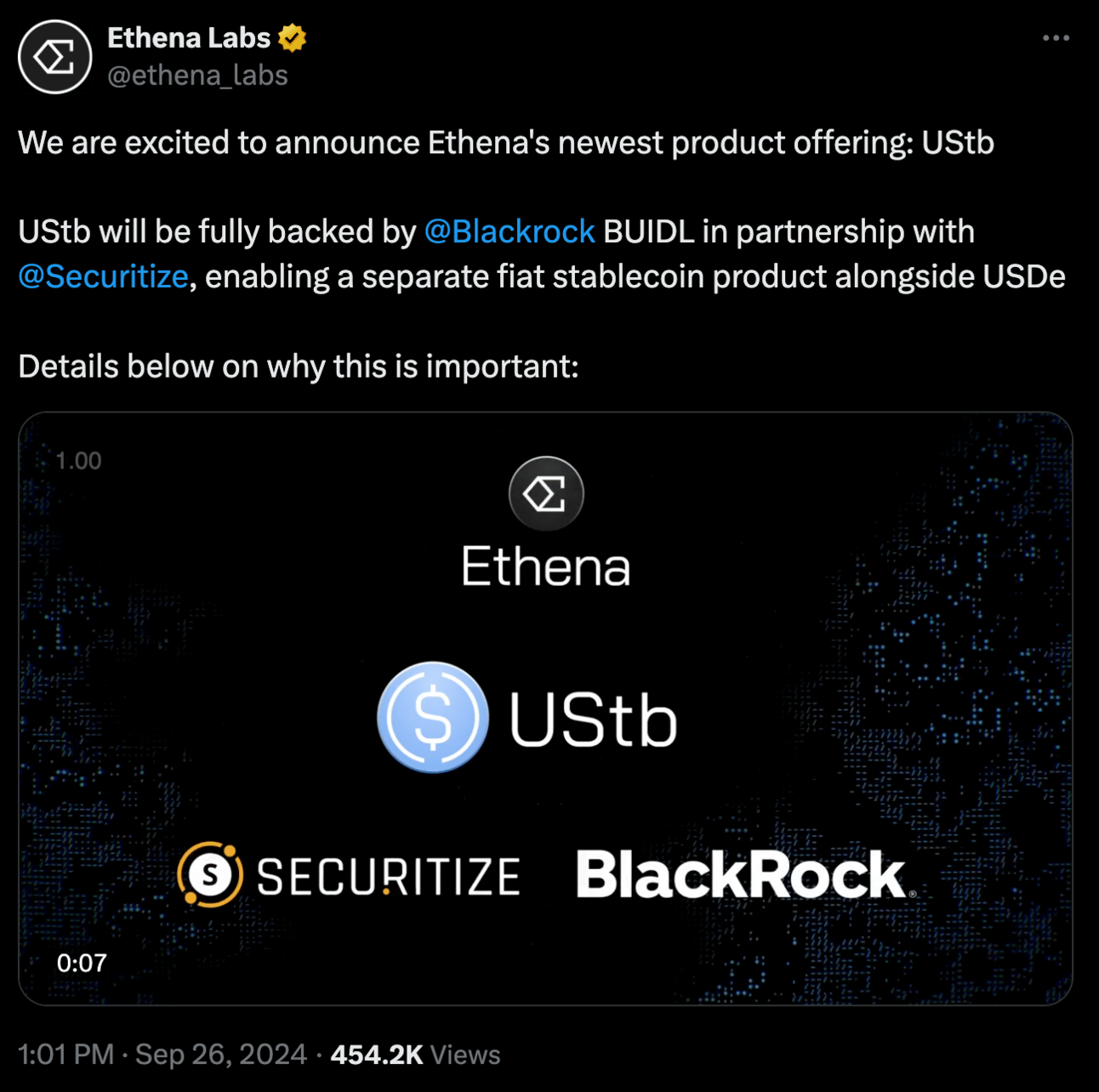 On September 26, Ethena announced UStb, a USD stablecoin fully backed by BlackRock BUIDL (a tokenized treasury fund on the Ethereum blockchain) in partnership with Securitize. This will be the second stablecoin issued by Ethena.