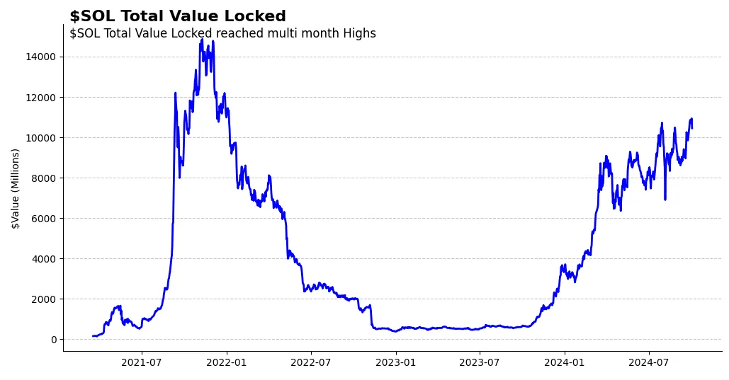 Solana’s total value locked has reached approximately $5.5 billion, a multi-month high, according to DefiLlama data (excluding all staked token variants).