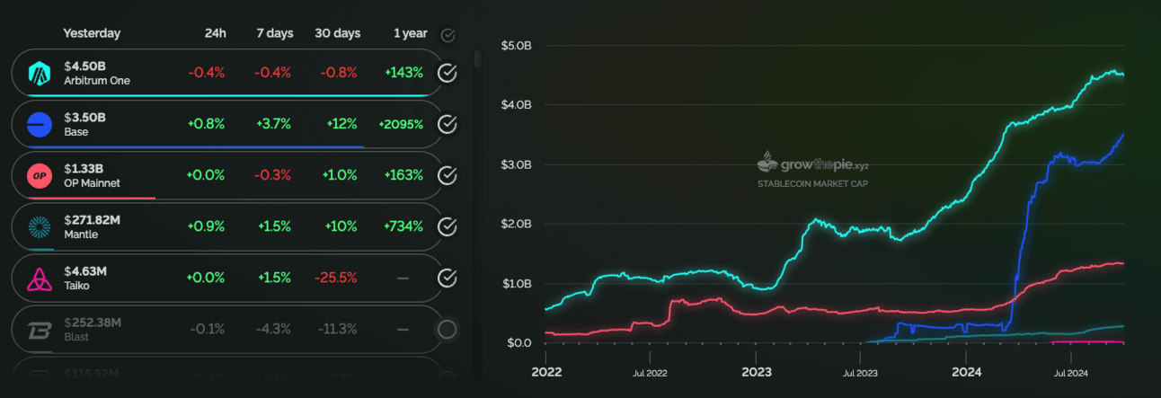 Arbitrum leads the L2 ecosystem with over $4.5 billion in stablecoins, but Base—the L2 backed by Coinbase—is showing explosive growth that could take it to the top. Over the past year, the stablecoin supply on Base has surged by an incredible 2095%!
