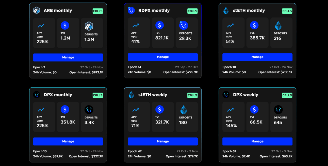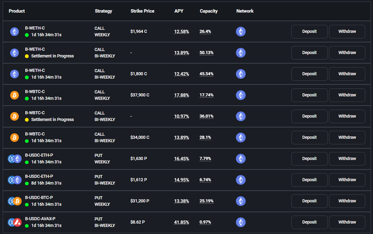 The platform is currently in its late v2 stage, with vaults earning yield in the form of premiums as the main product. Each option vault has a predefined delta and tenor designed to create a specific risk-adjusted yield denominated in the deposited asset. After each epoch, the basic vault reinvests the yield generated back into the vault, effectively compounding the yields over time.