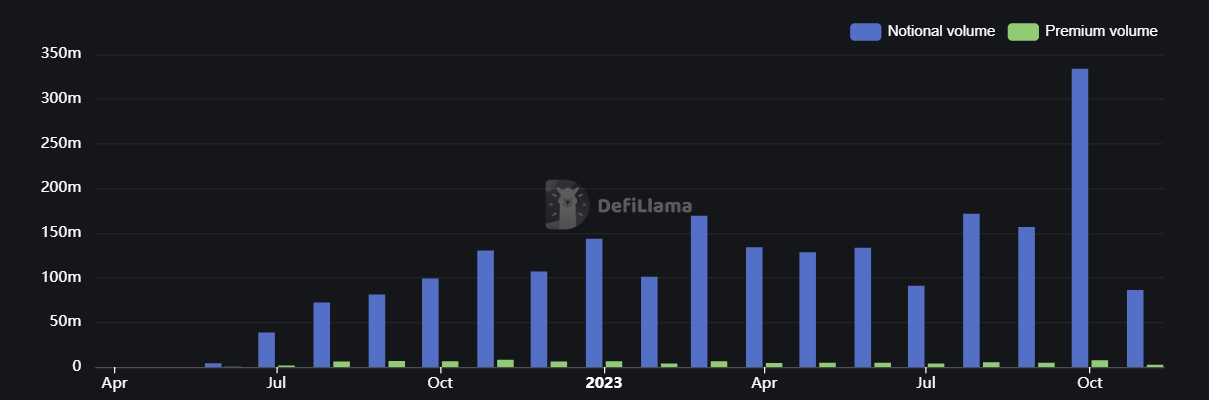 Furthermore, these types of projects tend to perform really well during high volatility periods, as there’s a need for hedging against downside risk, and market makers are willing to pay higher premiums. On the other side, during low volatility periods, there isn’t a high demand for these strategies, and these platforms tend to lose TVL and volumes, as happened in the last year.