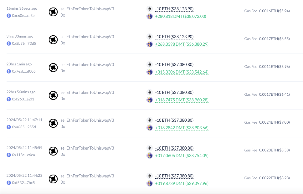 This address has been TWAP’ing 10 ETH clip on $DMT for a couple of days now.