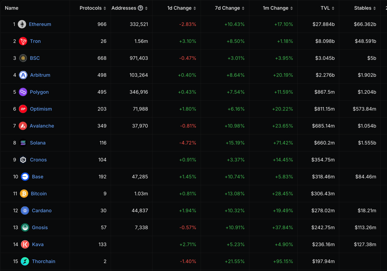 This creates a substantial opportunity for Layer 2s and alternative L1s to capture market size (once again). You want to look for chains with substantial inflows. As of now, there is no clear winner. We can see Arbitrum and Optimism pulling some heavy numbers and Base has a nice +10% 7D increase as well.