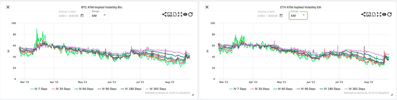 ETH IVs have risen to 39.74(31.8 last week) implying the options markets expect a 2.08% daily price move.