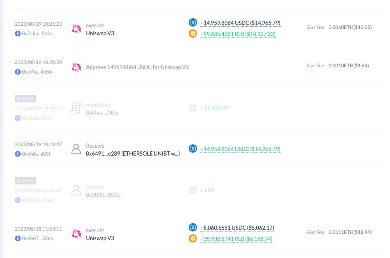 Ethersole has been selling his $UNIBOT bag and now holds 0 of his original migration bag. He rotated some of his gains into $RLB