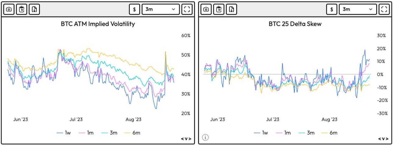 BTC IVs have risen to 42.4(35.2 last week) which implies the options markets expect a 2.21% daily price move.