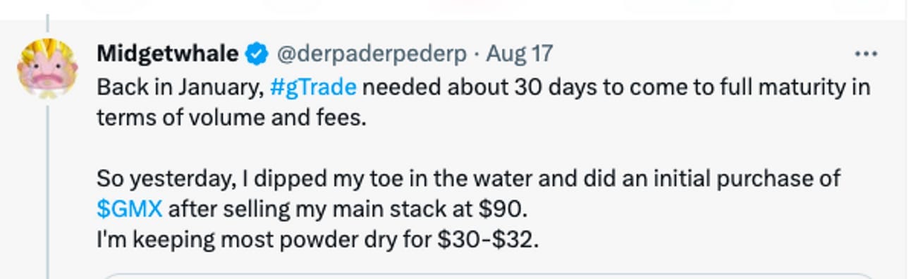Another big crypto persona, Midgetwhale started DCA’ing into $GMX (as he announced on his Twitter the day after too).