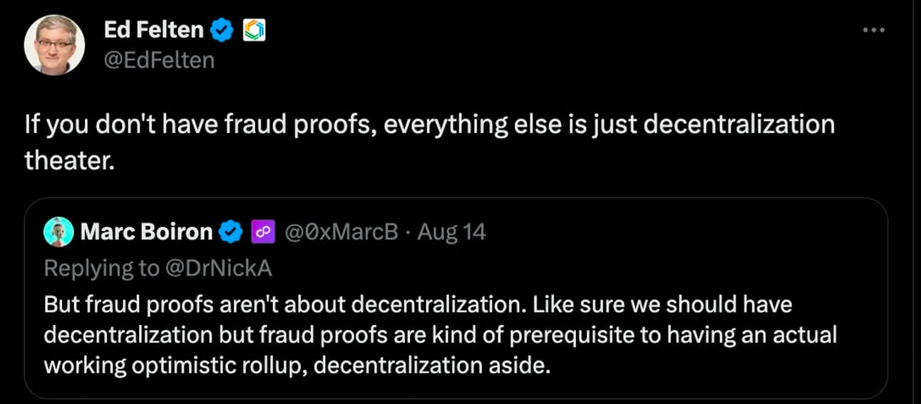Their competitors, however, hold a different view, arguing that fraud-proofs are not just “about decentralization” but effectively represent a pre-requisite for a working optimistic rollup.