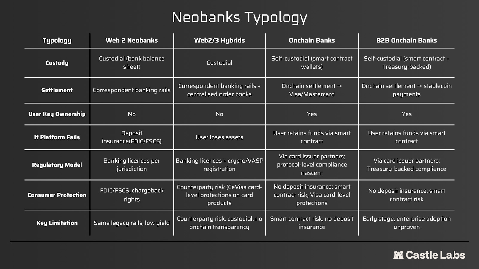 The distinction is structural: with a traditional neobank, assets sit on the bank’s balance sheet. With a crypto-powered neobank, assets sit on a transparent, verifiable ledger, and the user retains ownership. Each generation has moved closer to direct user control: from digitising the interface, to adding crypto asset access, to eliminating intermediaries entirely. If this model proves to be adopted by businesses, and if it can satisfy the regulatory demands of governments and consumer expectations of safety, the entire financial stack can be deployed onchain.