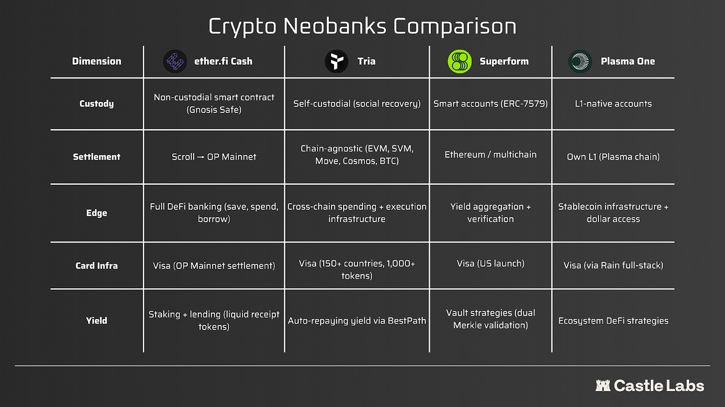 Onchain banks like ether.fi Cash, Tria, and Superform represent the architectural turn. Built on smart contract wallets, integrated with DeFi protocols for yield on deposits, and connected to Visa and Mastercard through card infrastructure providers, they are composable and yield-bearing by design, with varying degrees of user custody depending on the product.