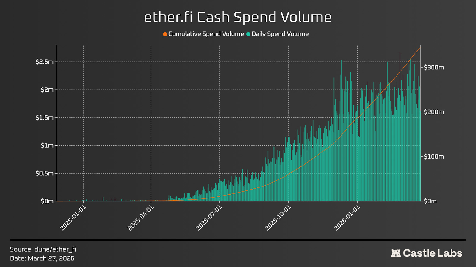 Ether.fi accounts for over a quarter of total spending volume across all crypto cards.