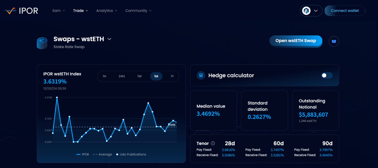 Using IPOR, users can trade the interest rate received on their assets (in this case, wstETH), opening the door to leverage, hedging, and speculation on the rate of staked assets.