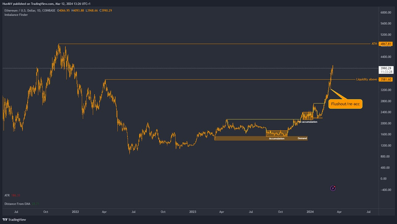 During mark-ups such as this one what we will often see is a big flush-out that liquidates all the late longs to reset the market (along with funding rates). This serves as a re-accumulation to fuel continuation. These moments provide beautiful opportunities for LTF longs, especially if they happen just below old resistance.