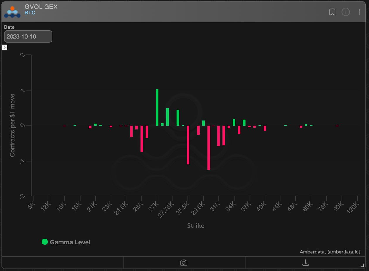 Considering BTC gamma charts, dealers are negatively positioned from 28.5k to 32k indicating that there may be some re-enforcing flows if we break past 28.5k.