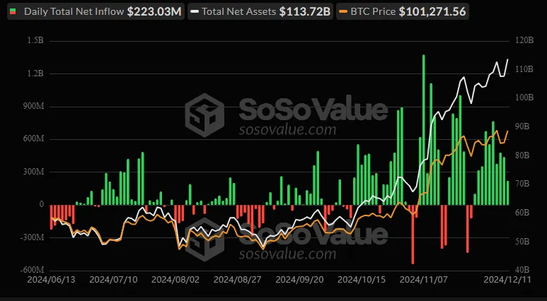 Over the past week, Bitcoin spot ETFs have maintained a remarkable streak of consistent inflows, adding $3.52B cumulatively. Starting from December 2, 2024, the daily inflows have ranged from $223.03 million to as high as $766.66 million on December 5, showcasing strong investor demand. This streak has propelled the cumulative total net inflow to $34.58B as of December 11, 2024.