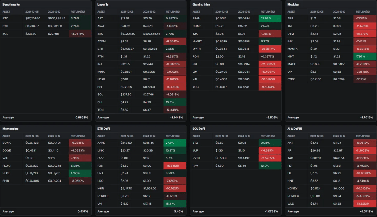 Interestingly, ETH DeFi had a great week, showcasing solid growth with assets like AAVE and UNI taking the spotlight. Others, however, have had a tougher time; Modulars and AI & DePIN have been weighed down by consistent losses across their major players, pointing to a broader sell-off or reduced interest in these niches. Meanwhile, meme coins have been a bright spot for retail enthusiasm, with assets like PEPE seeing double-digit growth.