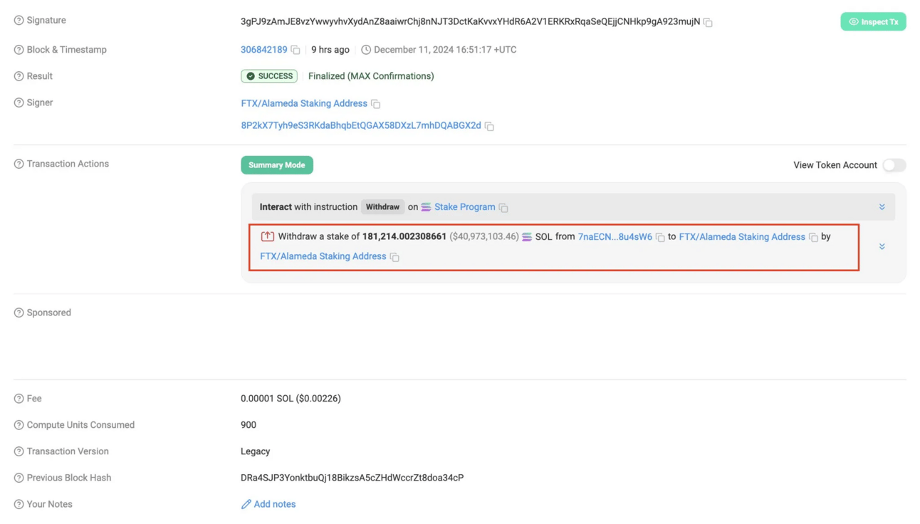 ALAMEDA WALLET UNSTAKES $41.5M OF SOL