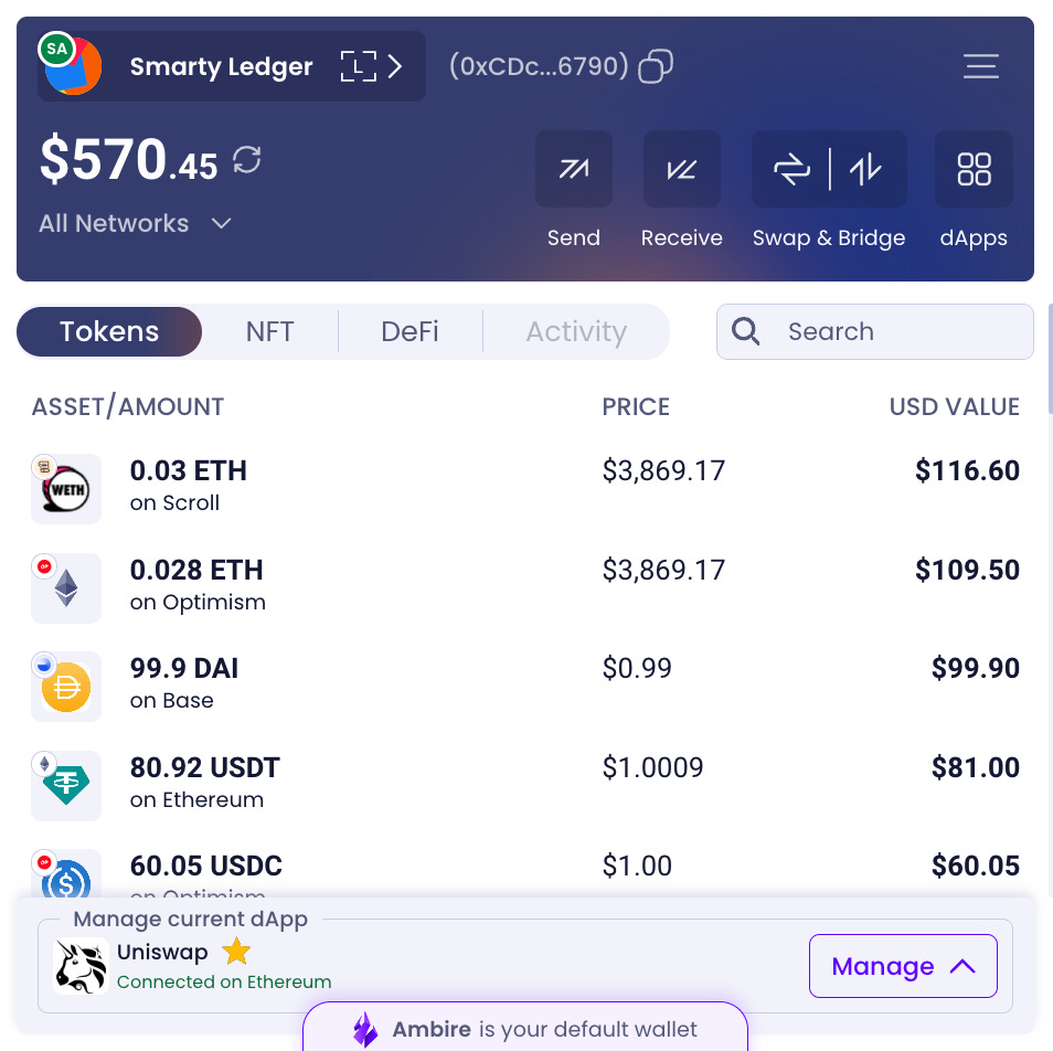 Ambire is a hybrid account abstraction wallet supporting EOAs and Smart Accounts on all EVM networks.