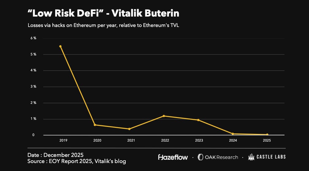 On the other hand, if you look at the fraction of TVL that gets hacked on Ethereum, it’s decreasing. We are moving into the “Low Risk DeFi” phase, as Vitalik mentioned in his article in September this year.