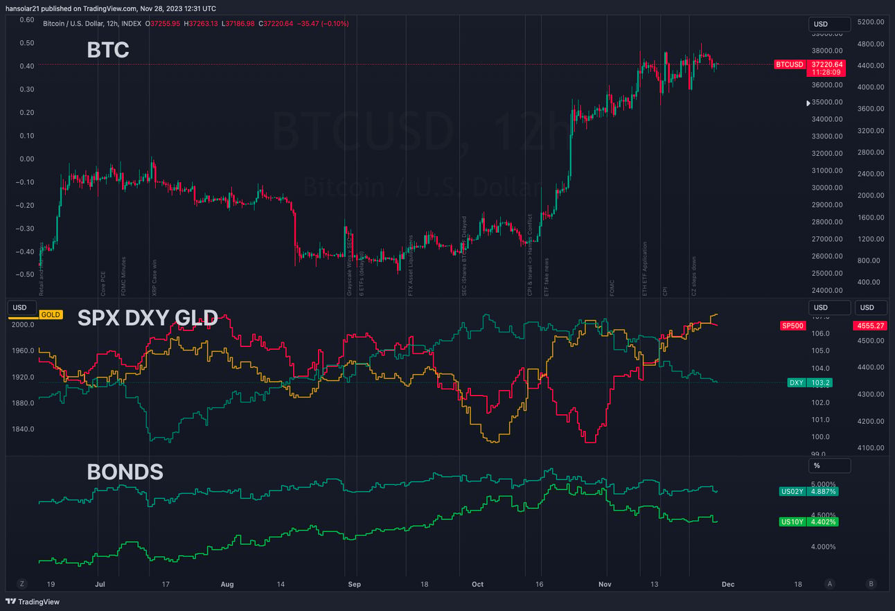 Bitcoin is showing some slowing momentum with about 40 days until the ‘fair’ spot ETF deadline on the 10th of Jan 2024. However macro conditions are still positive for risk.