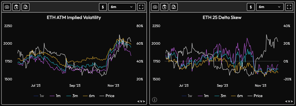 Monthly vols took large hits as BTC got rejected off of 38k. The options market looks to be taking a breather after continued upward pressure, yet long term skews continue to stay bullish.
