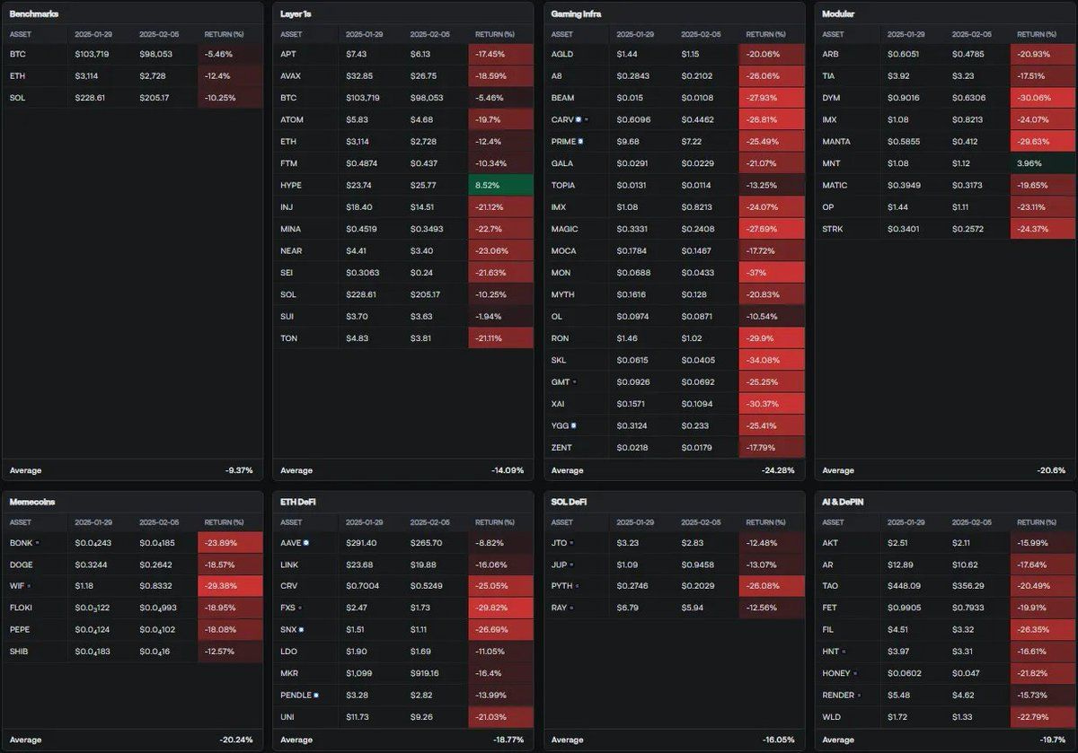 Meanwhile, AI & DePIN tokens gained +0.0%, with HNT up +16.71% but AR dropping -10.19%.