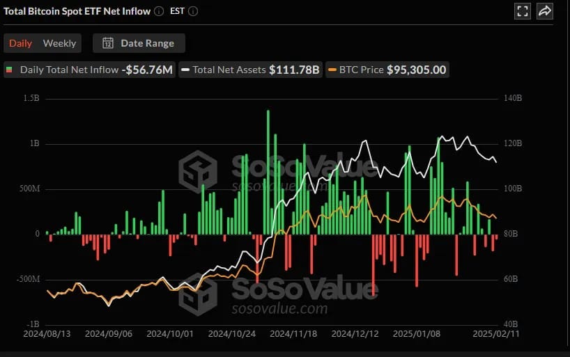 According to recent data, Bitcoin spot ETFs saw a total net outflow of $56.76 million on February 11, reflecting ongoing shifts in investor sentiment. Grayscale’s GBTC recorded no net outflows, keeping its total historical net outflow at $21.95 billion, while Grayscale Bitcoin Mini Trust ETF maintained a $1.24 billion net inflow.