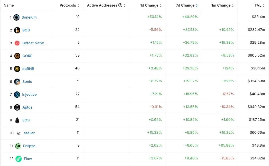 The performance of blockchain chains remains mixed this week. Among the top 50 chains, those with at least a 20% increase in Total Value Locked (TVL) over the past week include Core and Bob.